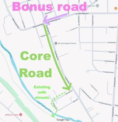 - Lower Cuyahoga St segment from 35 to 25 mph (in green, “Core Road”)