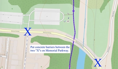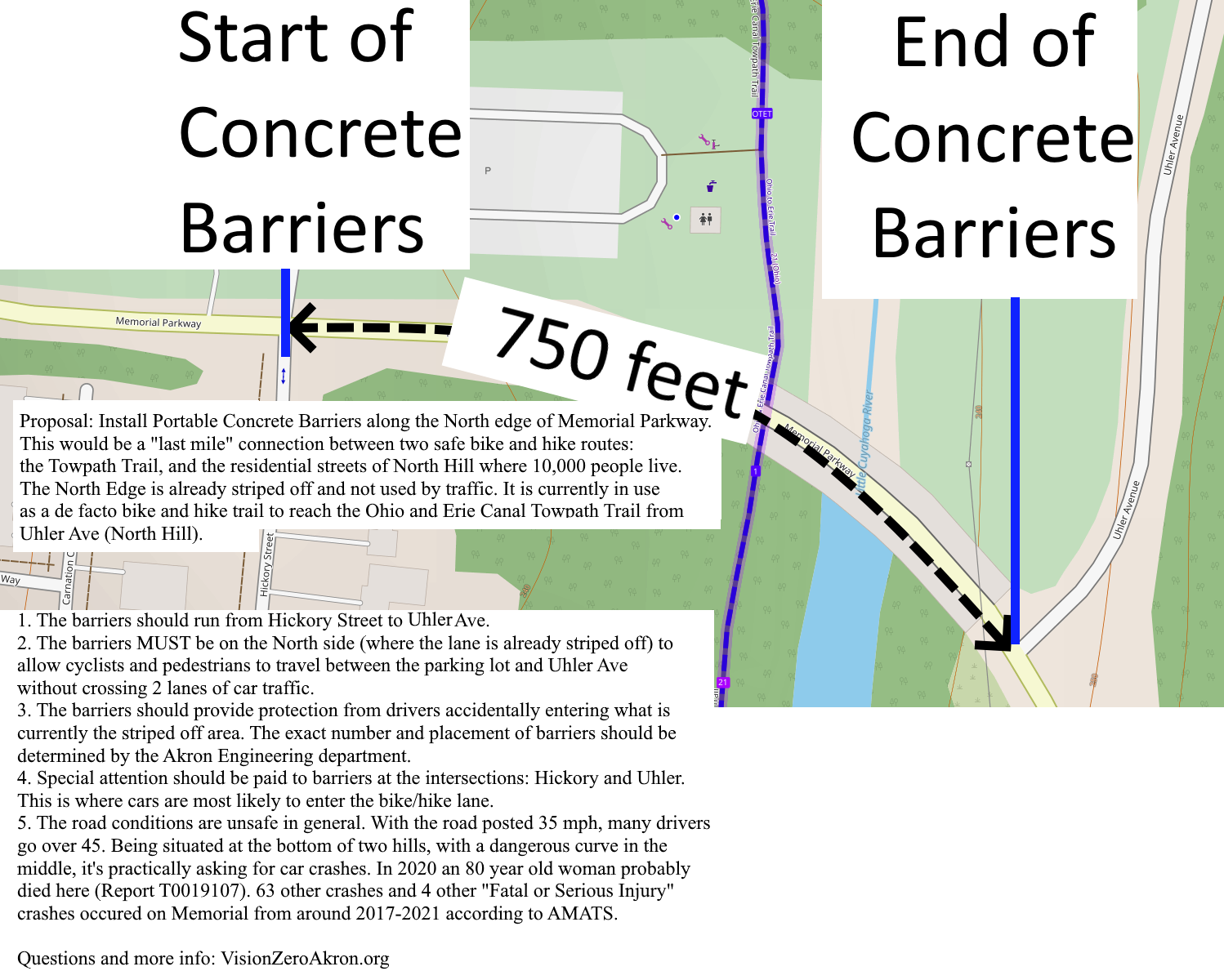 Just 750 feet of concrete could save lives. Concrete barriers are the easiest, cheapest way to make Memorial Parkway safe enough to use without a car. The far lane is already striped off and not in active use. All Akron needs to do is place barriers between Uhler Ave and Hickory Street. Memorial Parkway was named in memory of three people who died due to unsafe road design. It does their memories a disservice to wait around for the next preventable loss of life on the very same street.